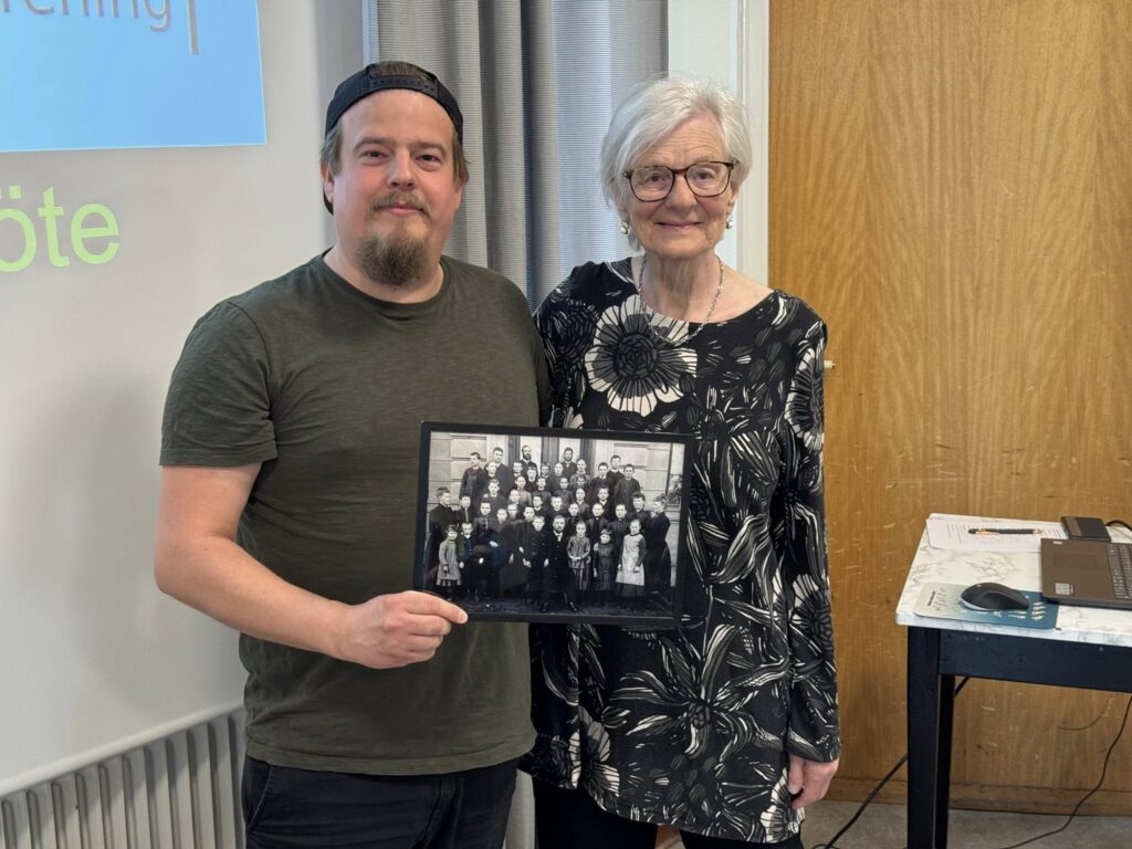ULDF ordförande Henrik tar emot en tavla med ett foto från Uppsala tidigare dövskola av Birgit Burman